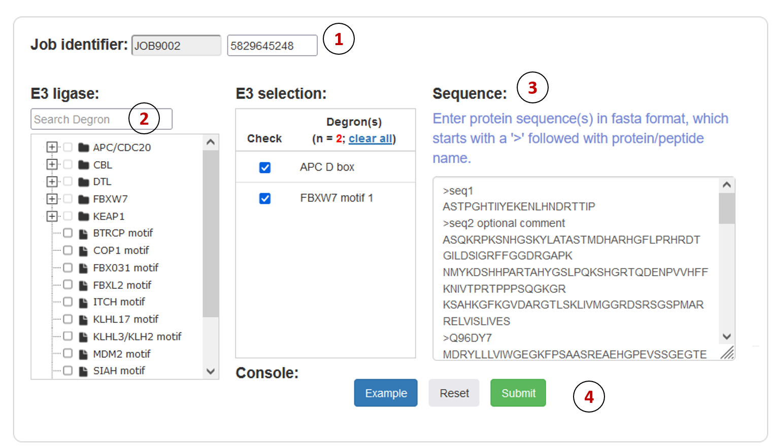 - Operation buttons: Submit, reset the submission form, or access the example dataset.