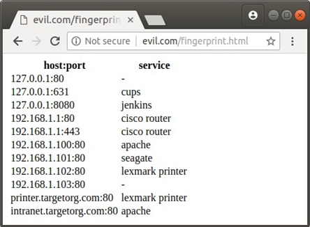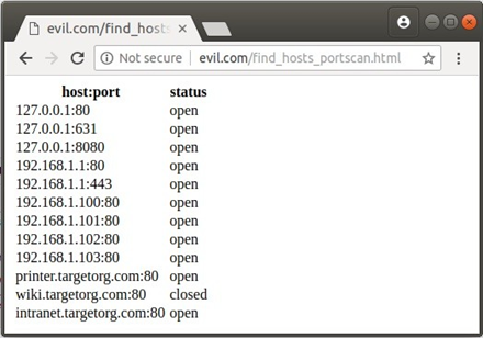 知道本地 IP 地址并通过主机的有根据的猜测,我们可以创建一个扫描端口主机的恶意页面,类似于一些可用的开源工具 [16]。将嵌入端口扫描的 JavaScript 的 HTML 文件放在其他域上,在一般情况下,这将是一个公共服务器。