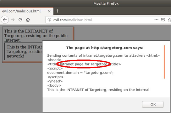 注意:攻击生效的条件之一是 targetorg.com 和 intranet.target.org 页面都定义了 'document.domain = "targetorg.com"',就同源策略而言,它们位于相同源。