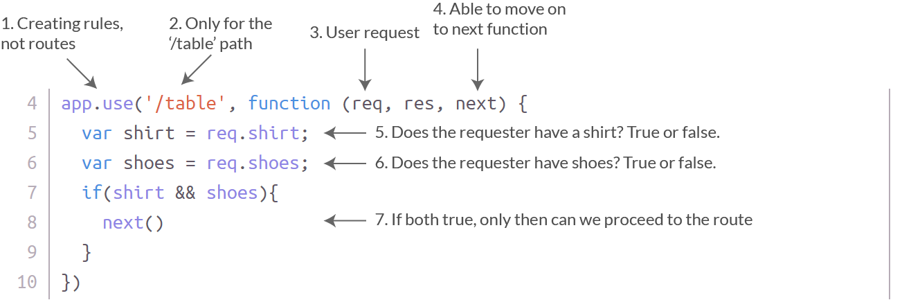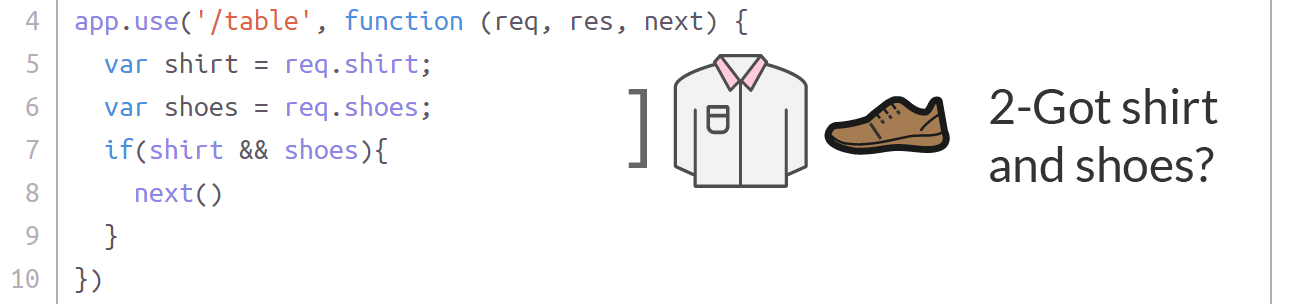 在第四行,你有一个匿名函数,参数 req,res 和 next。对于这个代码块的目的,你只是检查请求(req),看它是否有衬衫和鞋子。