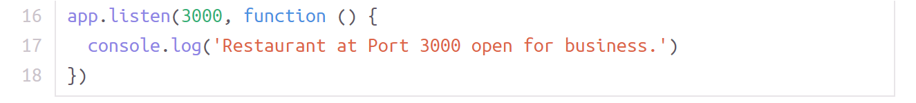 在你的浏览器中,并且你在运行你的 Node 应用程序,服务器知道运行特定的脚本。 在这种情况下,只要输入URL,您将在控制台中记录消息,并能够使用任何路由。 如果餐厅本身是您的电子商务应用程序,那么它现在在地址 3000 处开始营业。