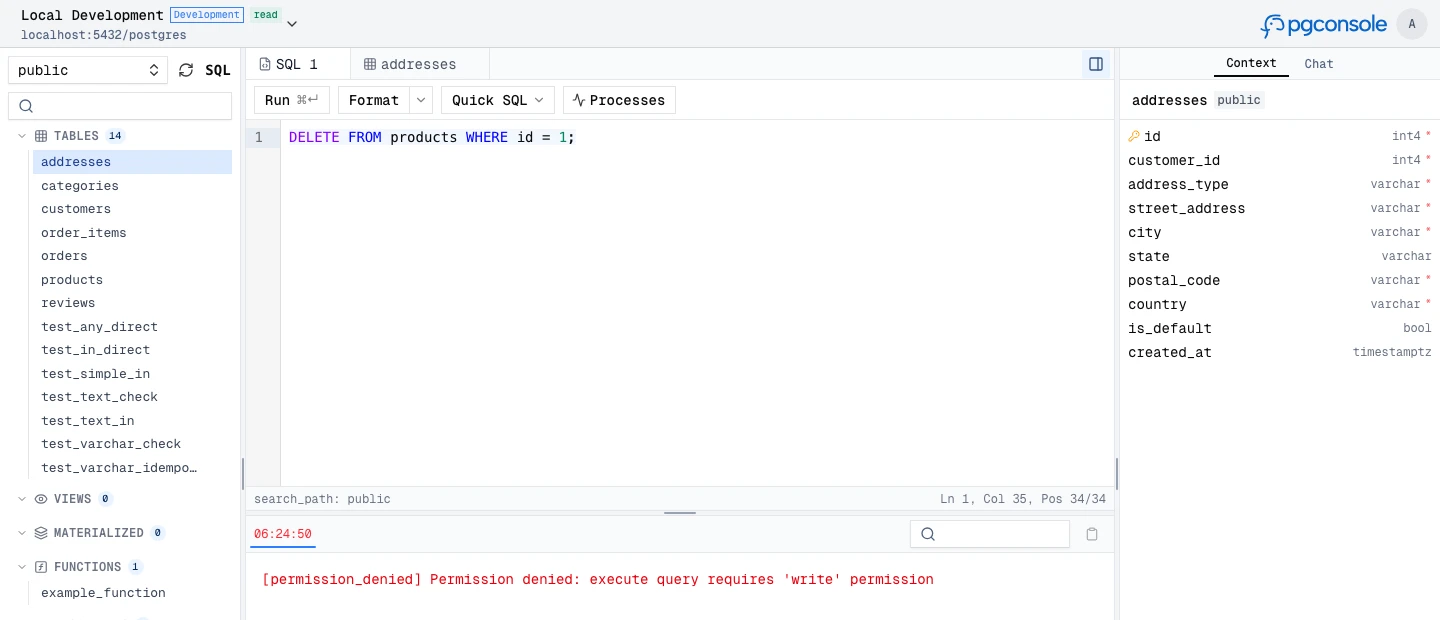 pgconsole --config pgconsole.tomlnpx @pgplex/pgconsole --config pgconsole.tomldocker run -p 9876:9876 -v /path/to/pgconsole.toml:/etc/pgconsole.toml pgplex/pgconsoleRun without --config to start in demo mode with a bundled sample database.